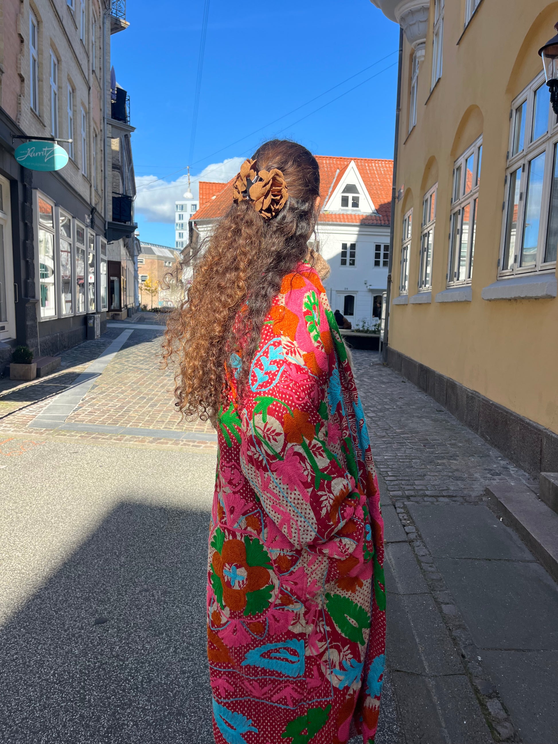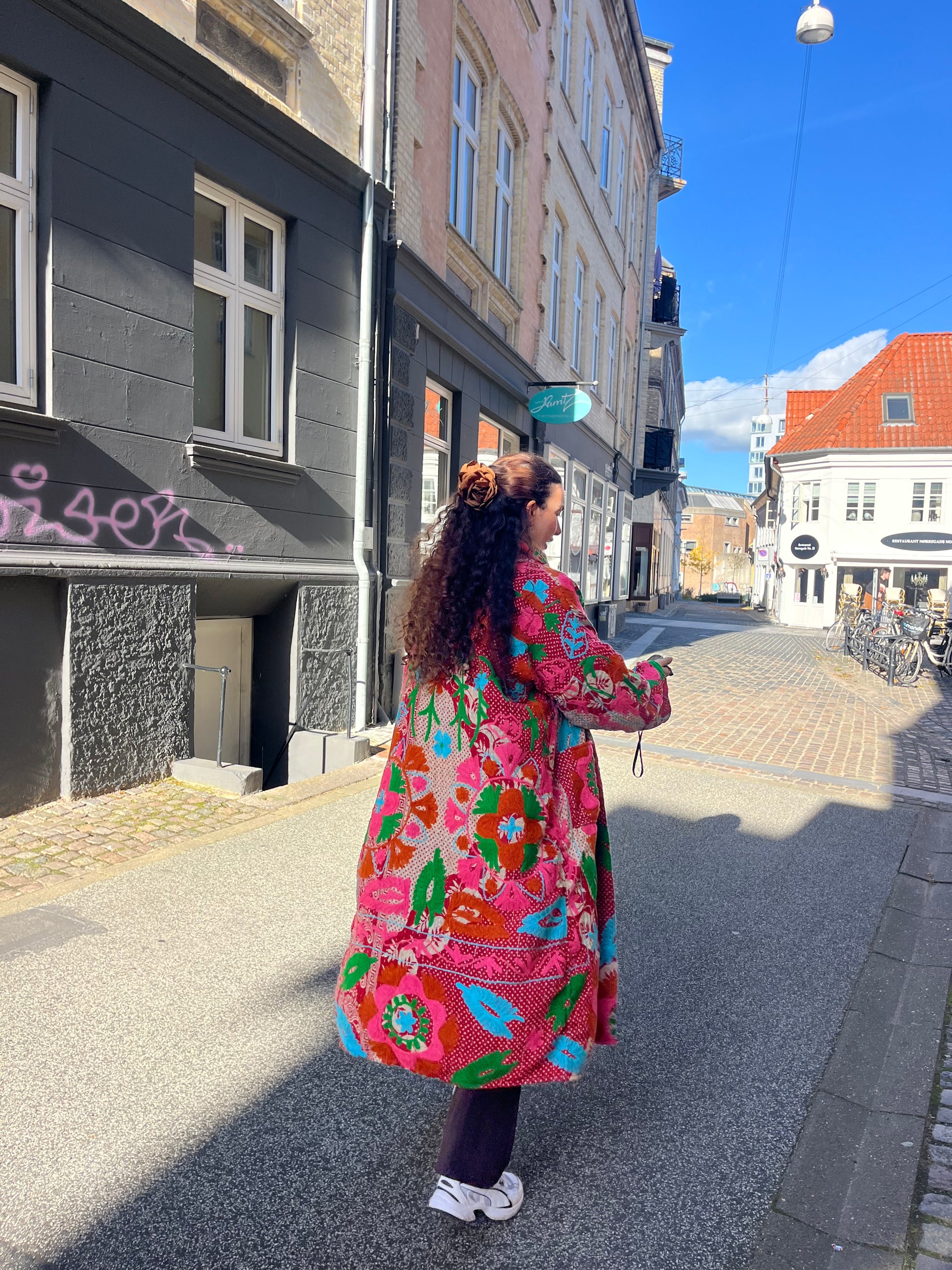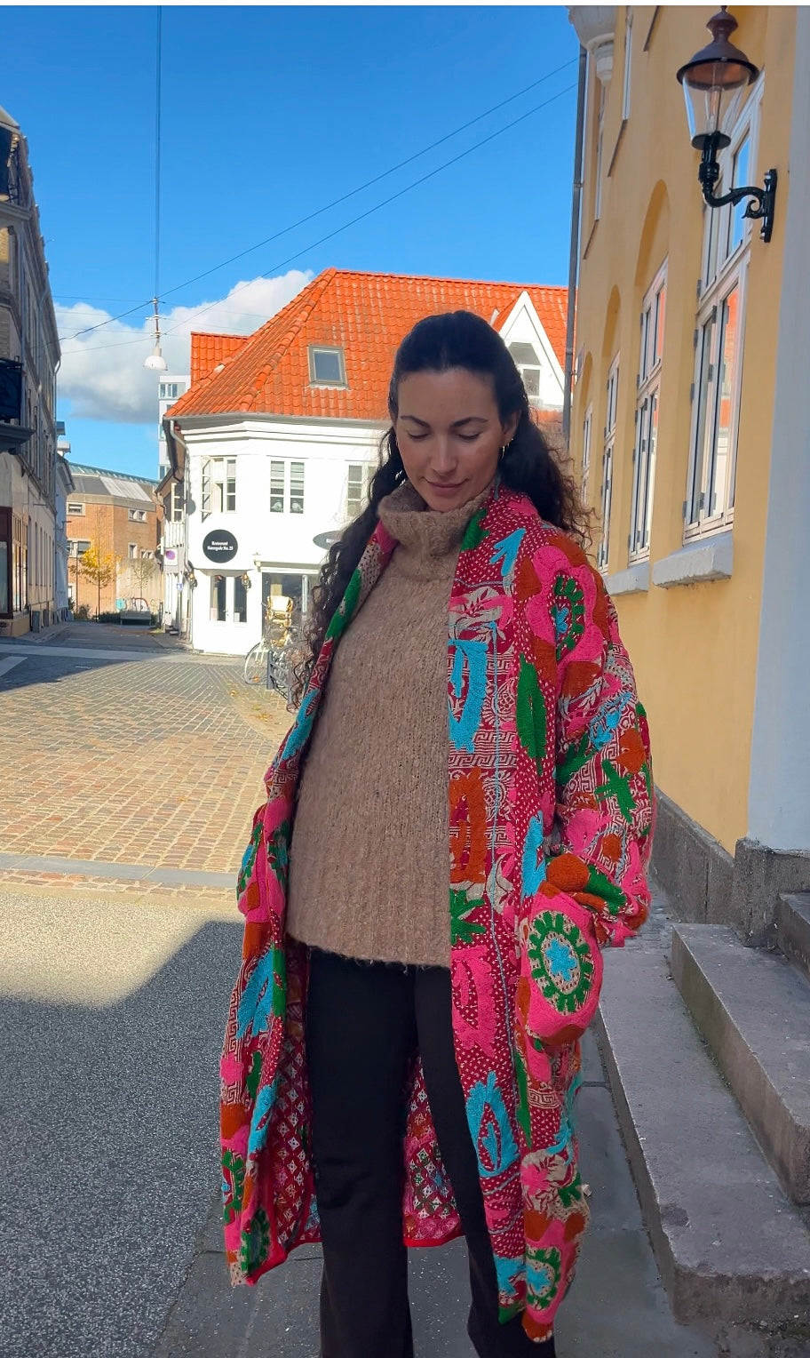 Lang kanthajakke af blød indisk vintagequilt med smukt og farverigt suzanibroderi