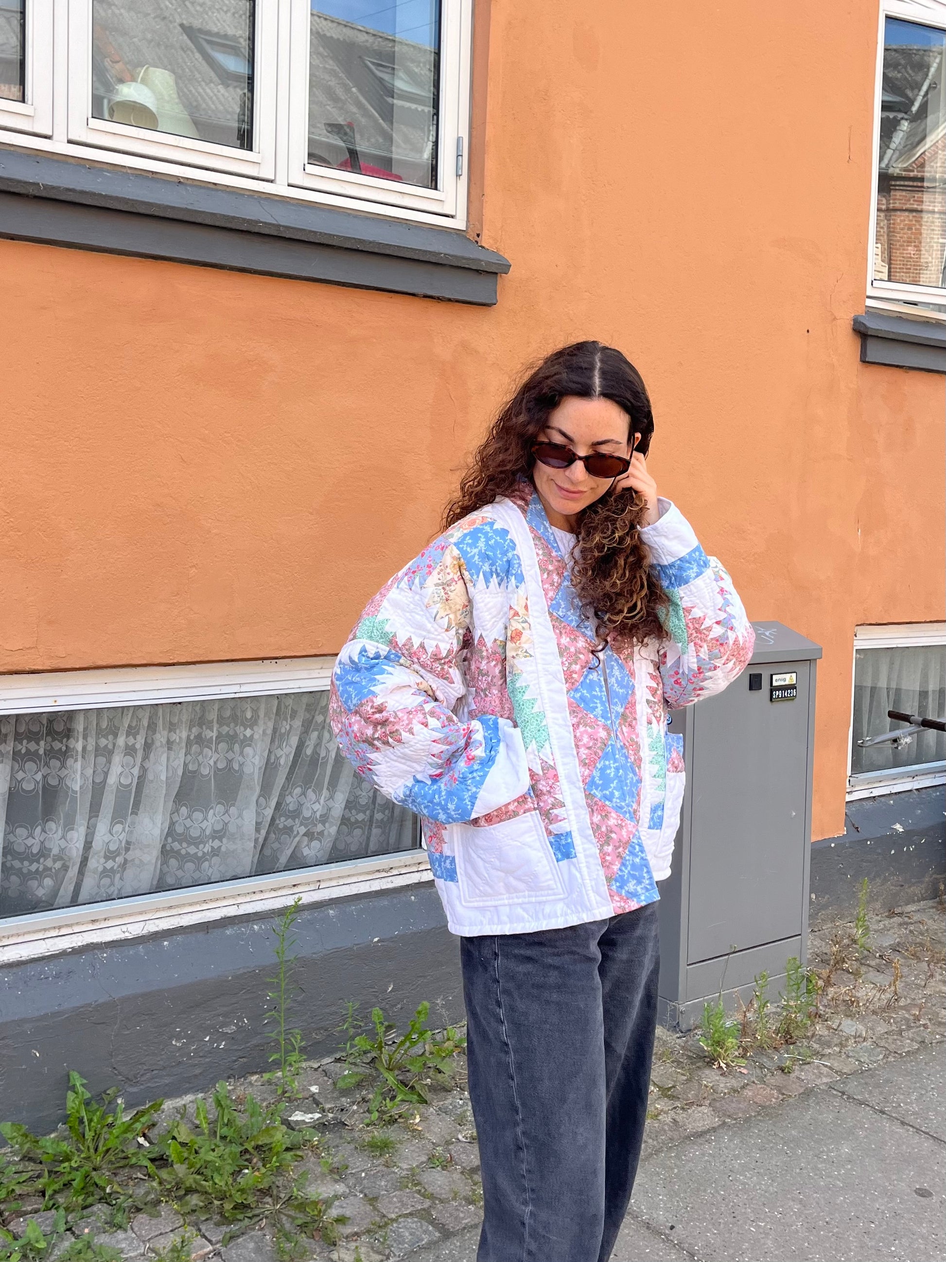 Flot quiltet patchworkjakke i romantiske pastelfarver og klassisk patchworkmønster.